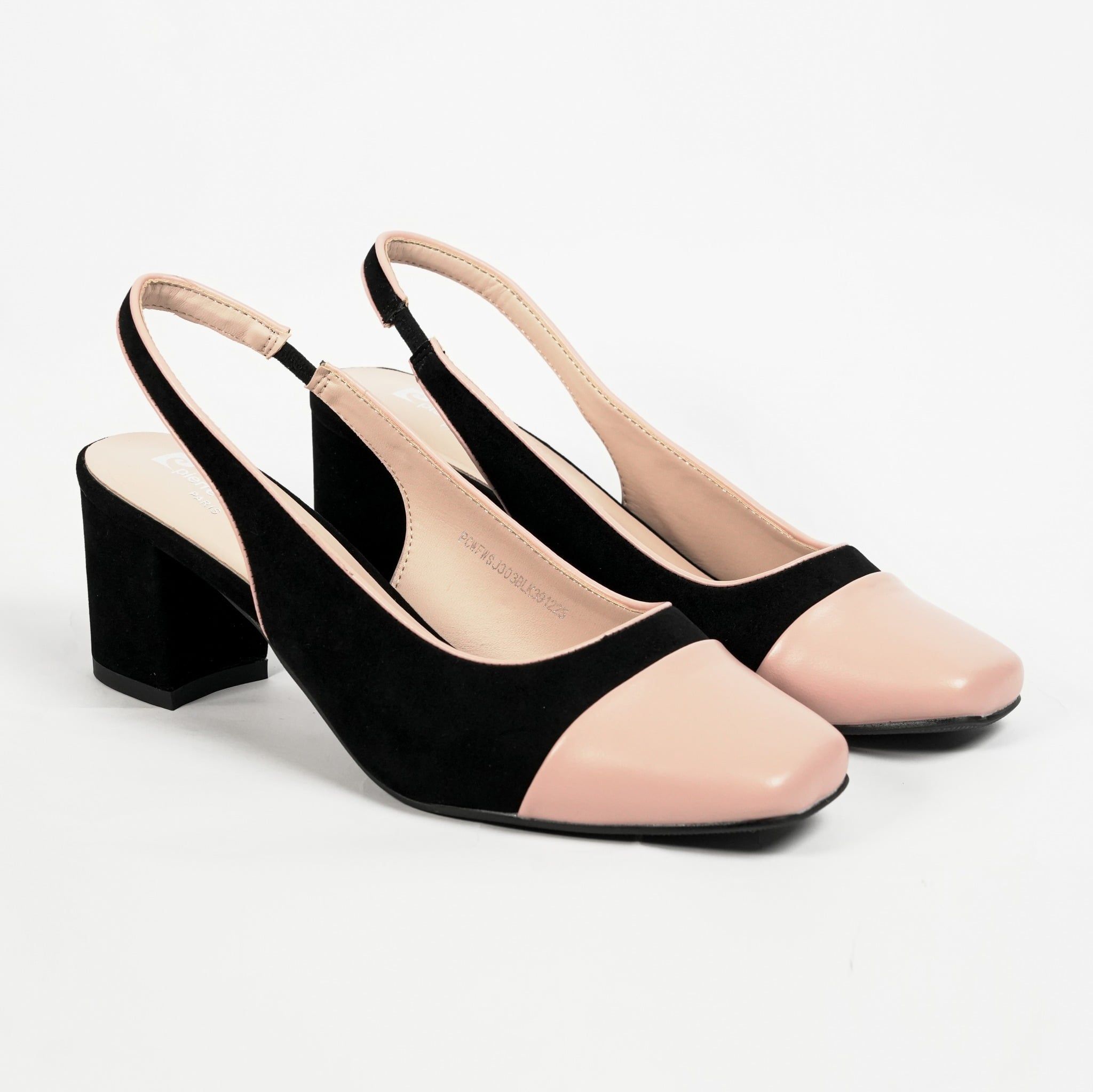 Sản phẩm mã 303 sở hữu kiểu dáng Slingback (quai hậu) thanh mảnh, giúp đôi chân trông thanh thoát và thông thoáng hơn. Điểm nhấn đắt giá nhất là phần mũi vuông phối màu hồng nude trên nền da lộn đen, tạo nên vẻ ngoài thời thượng, dễ dàng thu hút mọi ánh nhìn.